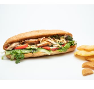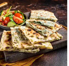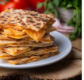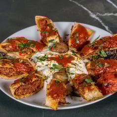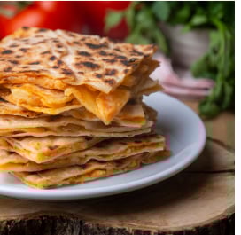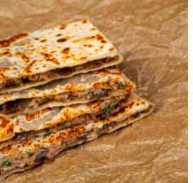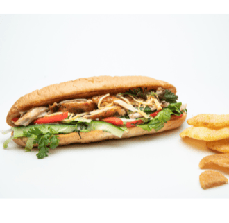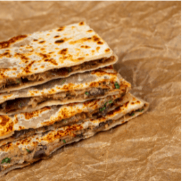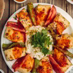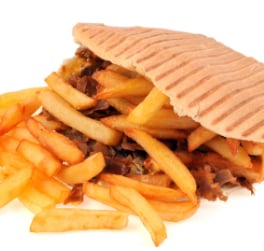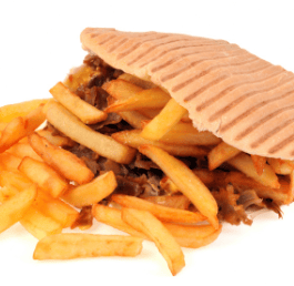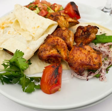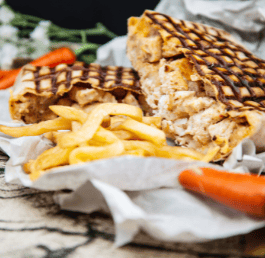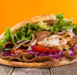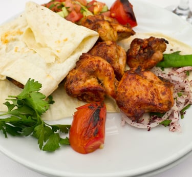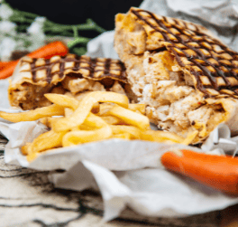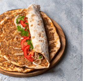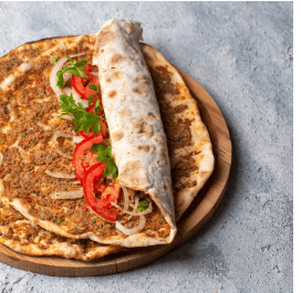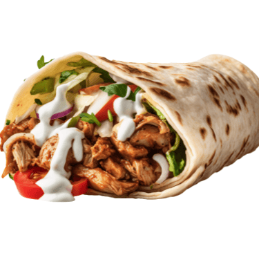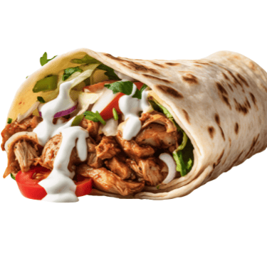 Émincé de poulet mariné, grillé et roulé dans un lavash, accompagné de sauce tomate et yaourt.