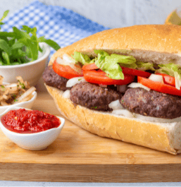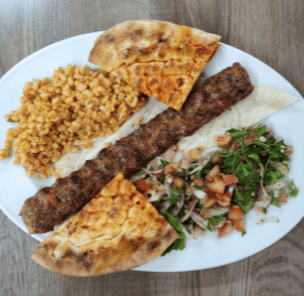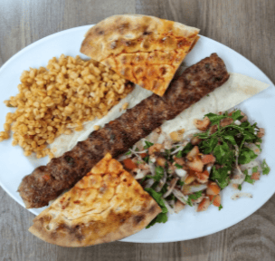 Viande Adana épicée, grillée et roulée dans un pain lavash, servie avec sauce tomate et yaourt.