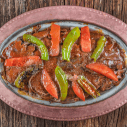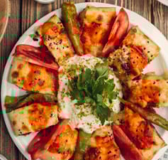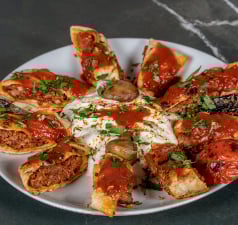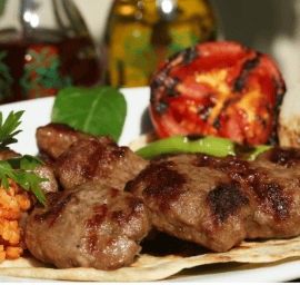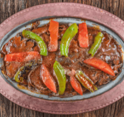 Fines tranches de viande grillée sur pain pita, nappées de sauce tomate et beurre, servies avec yaourt.