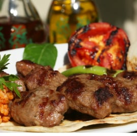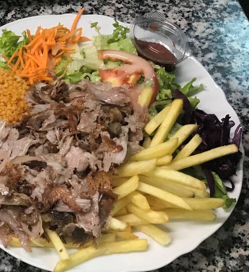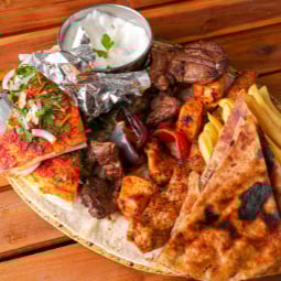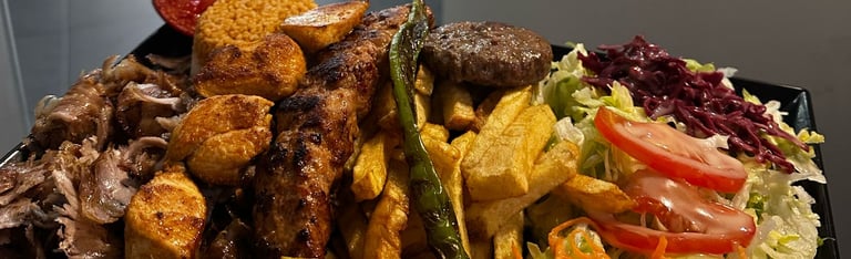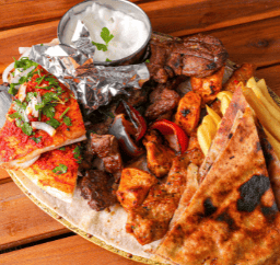 Assortiment de viandes grillées, servi avec riz, légumes et pain turc.