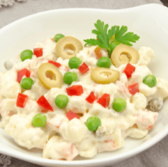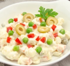 Salade crémeuse aux légumes et pommes de terre, liée au yaourt ou à la mayonnaise.